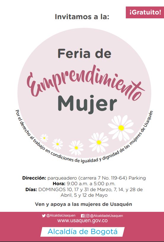Las ferias se llevarán a cabo los domingos, 10, 17, 31 de marzo, 7,14, 28 de abril y 5 y 12 de mayo en el Parqueadero de la carrera séptima No. 119-64; y se realizan dentro del marco del contrato de prestación de servicios No. 235 de 2018 celebrado entre el Fondo de Desarrollo Local de Usaquén y la Fundación Social Colombiana CedaVida, el cual tiene como fin realizar acciones que contribuyan a prevenir la violencia contra la mujer en la Localidad.