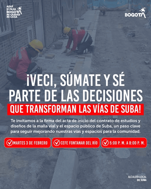 La Alcaldía Local de Suba extendió una invitación abierta a la ciudadanía para participar en un espacio clave de planificación y transformación urbana: la firma del acta de inicio del contrato de estudios y diseños de la malla vial y el espacio público de la localidad.