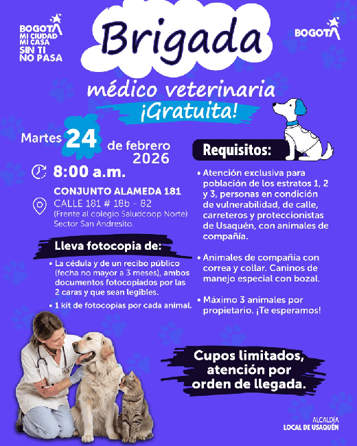 La Alcaldía Local de Usaquén invitó a los residentes de la localidad a participar en una nueva Brigada Médico Veterinaria gratuita dirigida a perros y gatos, con el propósito de promover el bienestar animal y la tenencia responsable de mascotas.