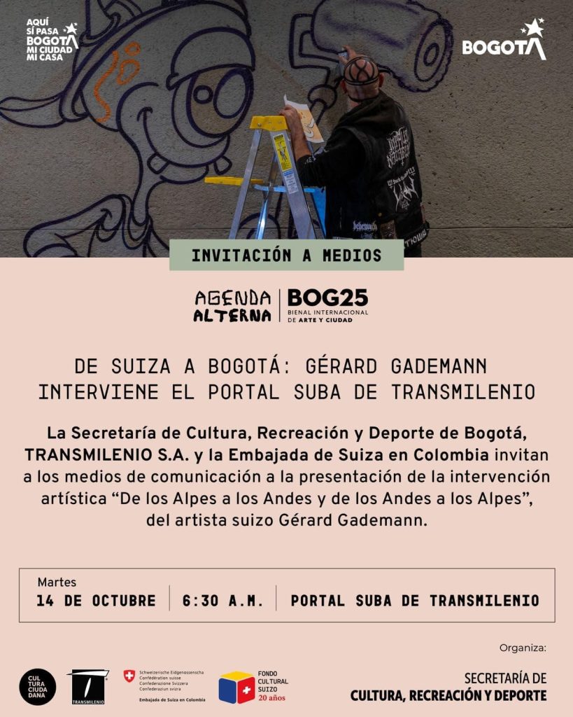 La obra de Gérard Gademann se integra al circuito de intervenciones urbanas que la Bienal BOG25 y TransMilenio han dispuesto en distintos puntos de la ciudad, consolidando a Bogotá como una ciudad que prioriza la cultura ciudadana y convierte espacios cotidianos como el Portal Suba en vibrantes galerías urbanas.
