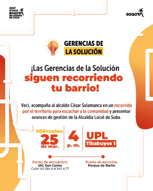 La Alcaldía Local de Suba continúa fortaleciendo su presencia en el territorio a través de las Gerencias de la Solución, una estrategia que busca acercar la administración a las comunidades y escuchar de primera mano sus necesidades.