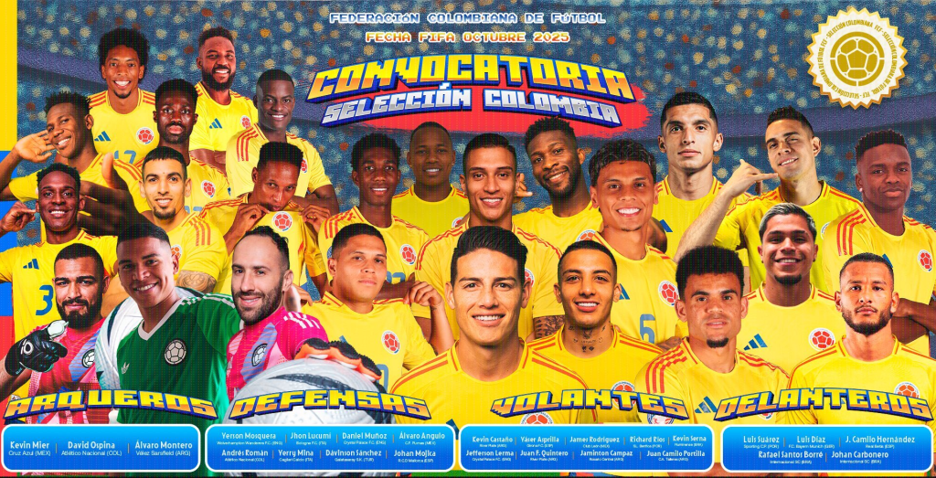 La Federación Colombiana de Fútbol presentó la convocatoria oficial de la Selección Colombia para los partidos de la próxima Fecha FIFA en octubre de 2025 ante México y Canadá. Con una mezcla de experiencia y juventud, el combinado nacional buscará sumar puntos clave en su camino hacia el Mundial 2026. Jugadores como James Rodríguez, Luis Díaz y David Ospina encabezan la lista de 26 elegidos. Los sacrificados fueron Jorge Carrascal, Camilo Vargas, Santiago Arias, Deiver Machado, Jhon Córdoba, Jhon Arias, Dayro Moreno y Marino Hinestroza, y de novedad llegaron Álvaro Montero, ‘Cucho’ Hernández, Kevin Serna, Rafael Santos Borré, Johan Carbonero, Yaser Asprilla