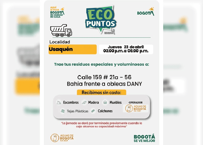 La recolección estará a cargo de la empresa Aguas Bogotá, encargada de garantizar la adecuada disposición de estos materiales, contribuyendo así a la limpieza y el cuidado del entorno.
