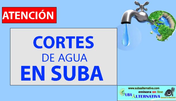 La Empresa de Acueducto de Bogotá anunció a través del Sistema Informativo SUBA ALTERNATIVA, la suspensión del servicio de agua potable en más 40 barrios de la localidad de suba el próximo martes 26 de febrero. Con el objeto de los cortes de agua es seguir ampliando la cobertura y mejorar las condiciones de suministro de agua, el Acueducto de Bogotá anunció la ejecución de trabajos en el occidente de suba, que obligan a suspender a partir de las 10 de la mañana y por espacio de 24 horas el agua en los siguientes sectores: