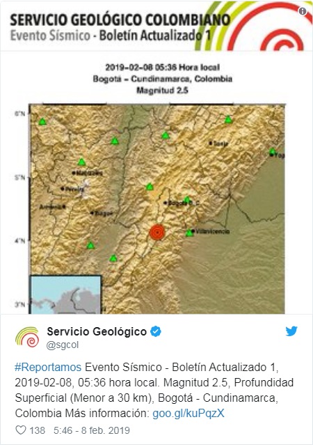 En la madrugada de este viernes 08 de febrero del presente año, se sintió un temblor con una magnitud fue de 2.5 grados con una profundidad menor a 30 kms, se reporta el epicentro en la capital del país. También lo sintieron Tolima y Cundinamarca.