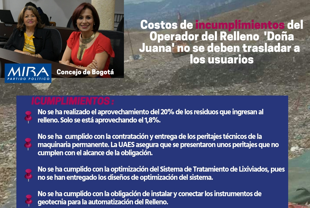 La Bancada del Partido Político MIRA, integrada por las Concejalas Olga Victoria Rubio Cortes y Luz Mireya Camelo, aseguró que urge tomar medidas contundentes frente al incumplimiento del operador del relleno sanitario Doña Juana, pues a pesar de que ya venció el plazo para cumplir lo ordenado en el laudo arbitral emitido el pasado 28 de septiembre por el Tribunal de la Cámara de Comercio de Bogotá, el operador sigue incumpliendo cinco de los once puntos prioritarios, de acuerdo con un informe de la Personería Distrital.
