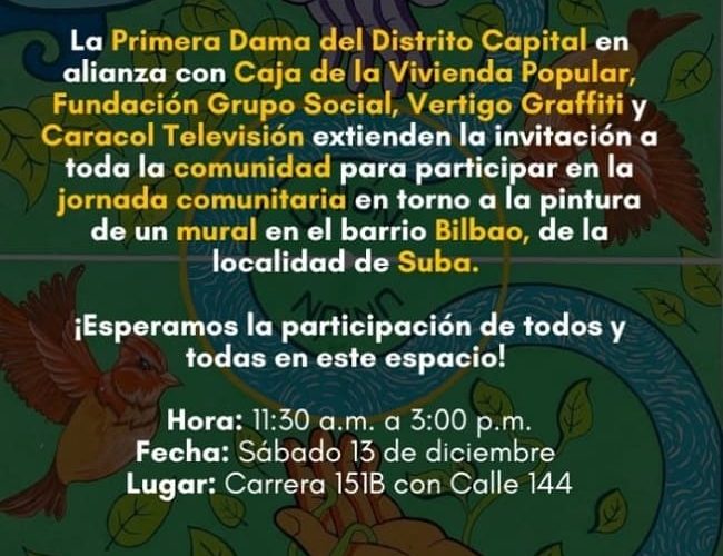 La Primera Dama del Distrito Capital, en alianza con Caja de la Vivienda Popular, Fundación Grupo Social, Vértigo Graffiti y Caracol Televisión, extendió la invitación a toda la comunidad para participar en una jornada comunitaria de pintura de un mural en el barrio Bilbao, localidad de Suba.
