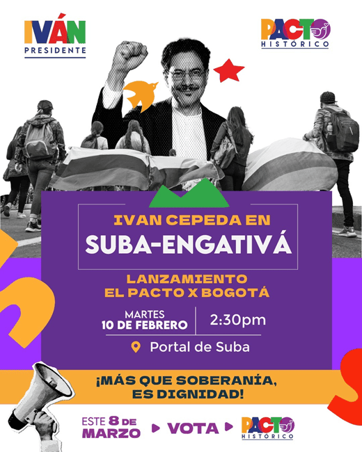 El senador Iván Cepeda realizará este martes 10 de febrero un recorrido por las localidades de Suba y Engativá, a partir de las 2:30 de la tarde, con el objetivo de dialogar con las y los residentes de estos sectores de Bogotá y fortalecer el trabajo político y social en los territorios.
