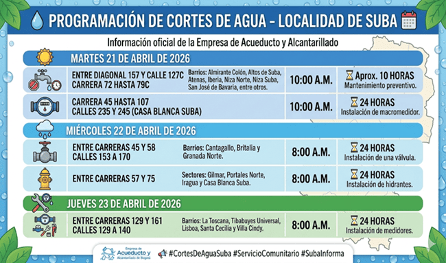 Más de 40 barrios de la localidad de Suba se verán afectados por la suspensión temporal del servicio de agua potable entre el 20 y el 24 de abril, debido a trabajos de reparación, mantenimiento e instalación en las redes de distribución.