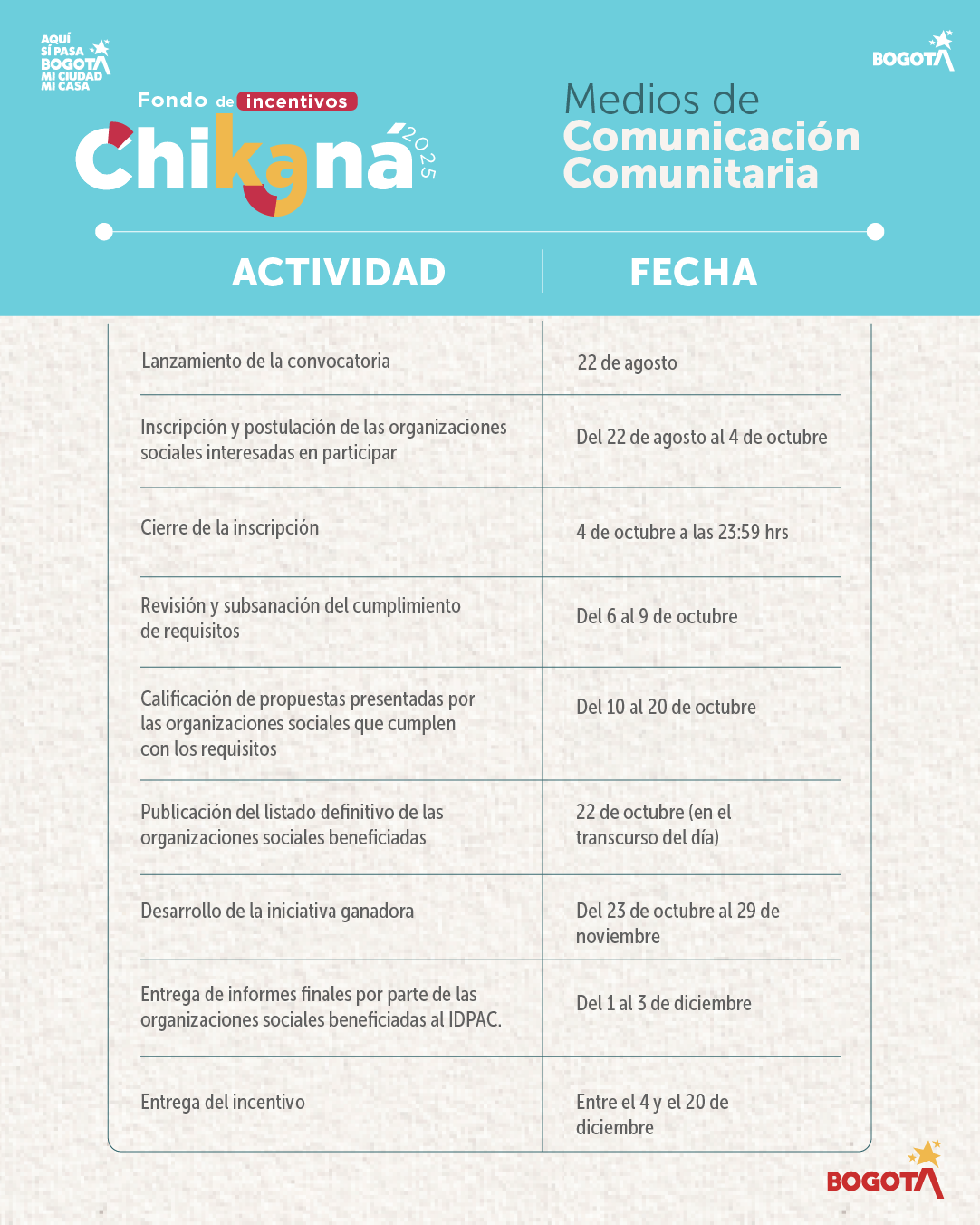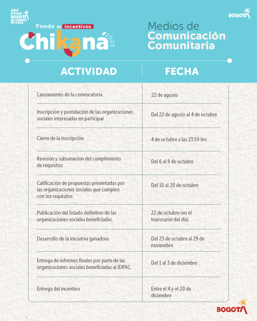 Según Morales, el Fondo Chicaná, que ya tiene varios años de historia, busca que líderes y organizaciones tengan la posibilidad de inscribirse a este proceso. Por primera vez en la historia del IDPAC, en el gobierno del alcalde Carlos Fernando Galán, se incluirá a las Juntas de Acción Comunal y a las Instancias de Participación como participantes elegibles, abriendo la puerta a un espectro más amplio de actores sociales.