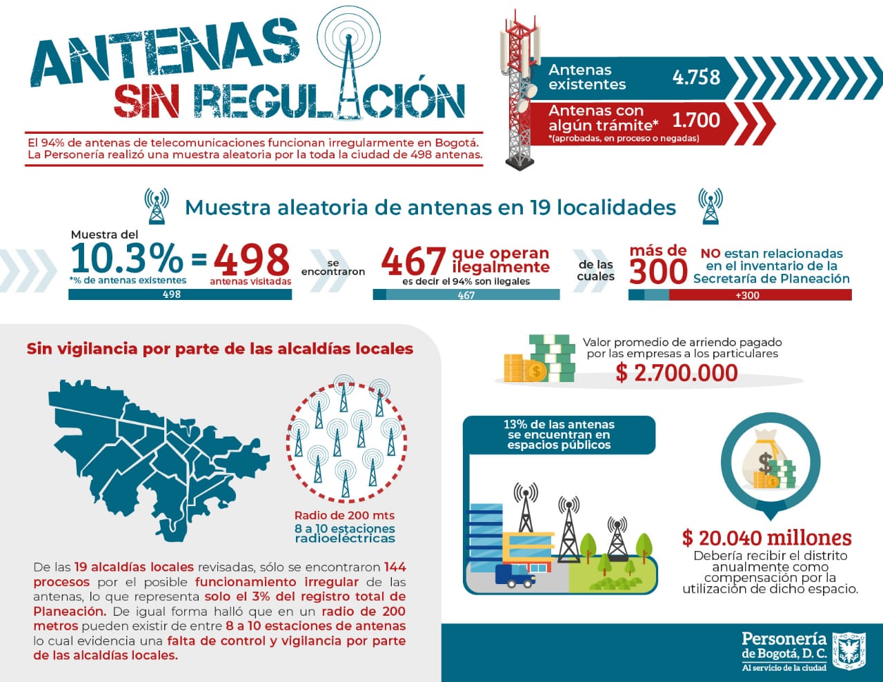 La Personería de Bogotá determinó, en una muestra aleatoria, que de 498 antenas (estaciones radioeléctricas de telecomunicaciones) visitadas en toda la Ciudad, 467 funcionan de manera irregular; es decir, el 94%. En otras palabras, sólo el 6% de ellas operan legalmente al estar aprobadas por la Secretaría de Planeación.