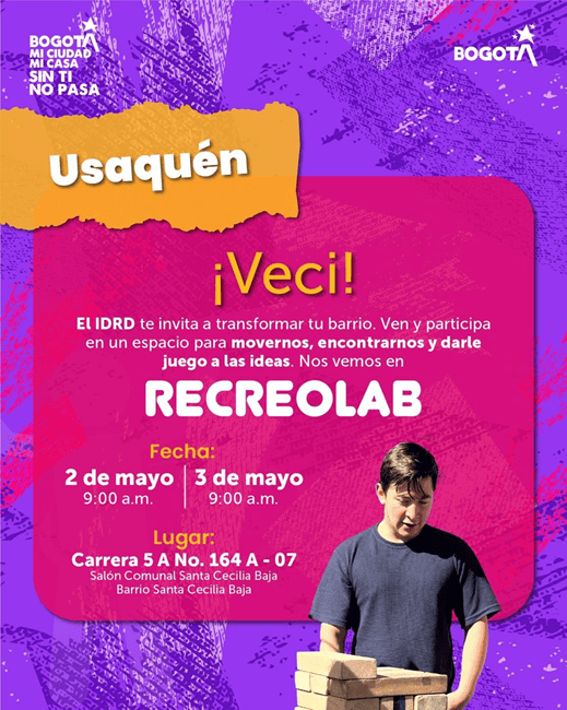 Así bien, Recreolab propone un espacio participativo en el que, mediante dinámicas lúdicas, la comunidad podrá construir colectivamente proyectos que promuevan el bienestar, la convivencia y el uso adecuado del tiempo libre.