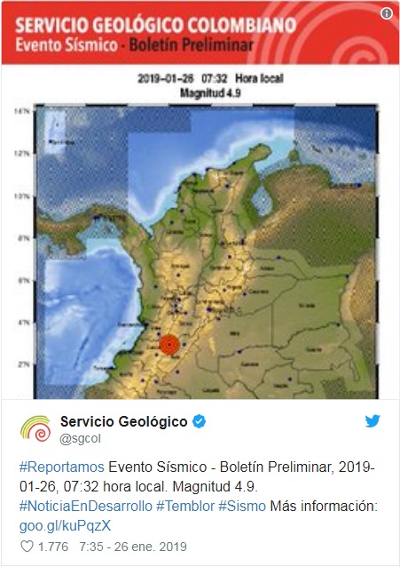 Reportes de redes sociales indican que el temblor en Colombia hoy sábado 26 de enero fue sentido en varias ciudades. Cali y Neiva fueron algunas de las más afectadas, pero reportes indican que se sintió en Bogotá y Medellín.
