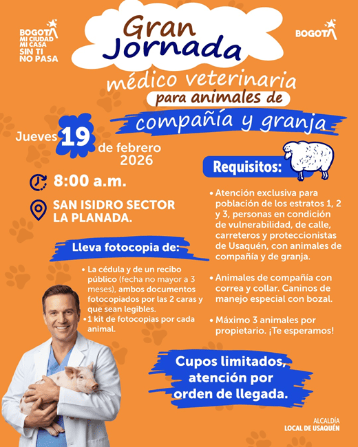 La Alcaldía Local de Usaquén invitó a la comunidad a participar en la Gran Jornada Médico Veterinaria, un espacio gratuito dirigido a animales de compañía y de granja, que busca promover el bienestar y la tenencia responsable en la localidad.